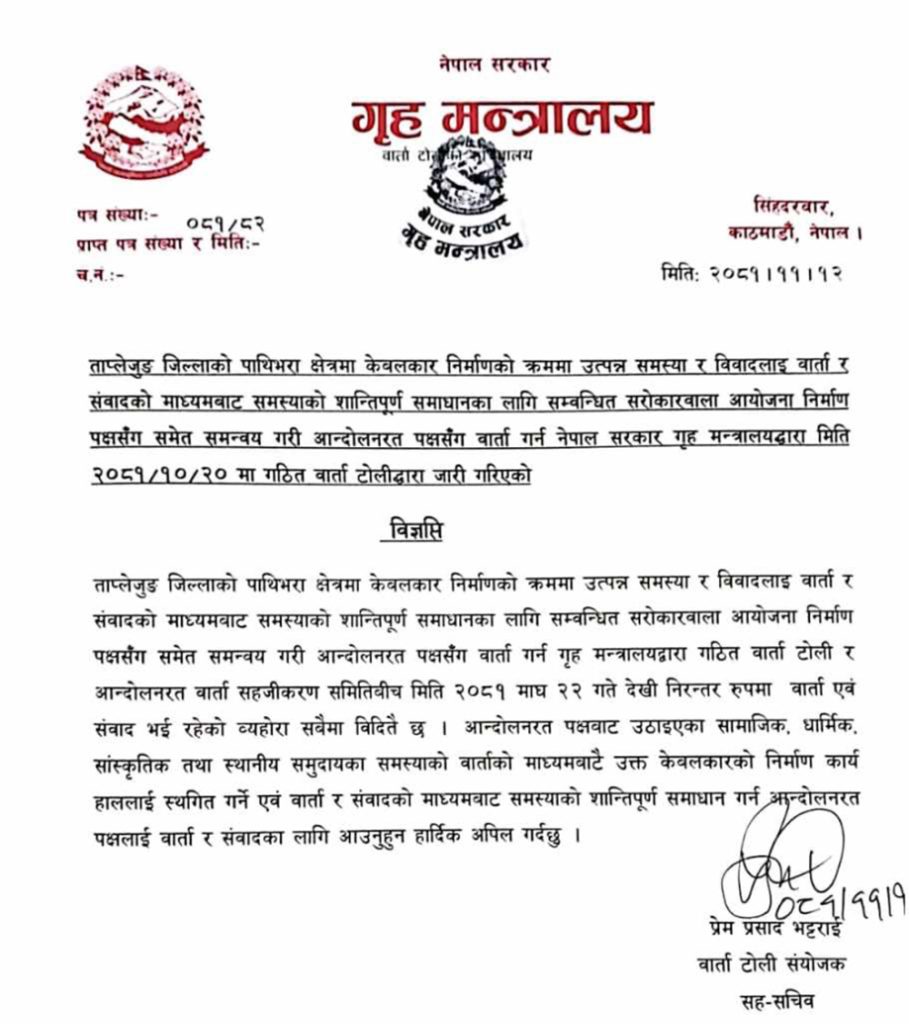 ताप्लेजुङ जिल्लाको पाथिभरा क्षेत्रमा केबलकार निर्माणको क्रममा उत्पन्न समस्या र विवादलाई वार्ता र संवादको माध्यमबाट समस्याको शान्तिपूर्ण समाधानका लागि सम्बन्धित सरोकारवाला आयोजना निर्माण पक्षसँग समेत समन्वय गरी आन्दोलनरत पक्षसँग वार्ता गर्न गृह मन्त्रालयद्वारा गठित वार्ता टोली र आन्दोलनरत वार्ता सहजीकरण समितिबीच मिति २०८१ माघ २२ गते देखी निरन्तर रुपमा वार्ता एवं संवाद भई रहेको व्यहोरा सबैमा विदितै छ । आन्दोलनरत पक्षवाट उठाइएका सामाजिक, धार्मिक, सांस्कृतिक तथा स्थानीय समुदायका समस्याको वार्ताको माध्यमबाटै उक्त केवलकारको निर्माण कार्य हाललाई स्थगित गर्ने एवं वार्ता र संवादको माध्यमबाट समस्याको शान्तिपूर्ण समाधान गर्न आन्दोलनरत पक्षलाई वार्ता र संवादका लागि आउनुहुन हार्दिक अपिल गर्दछु ।