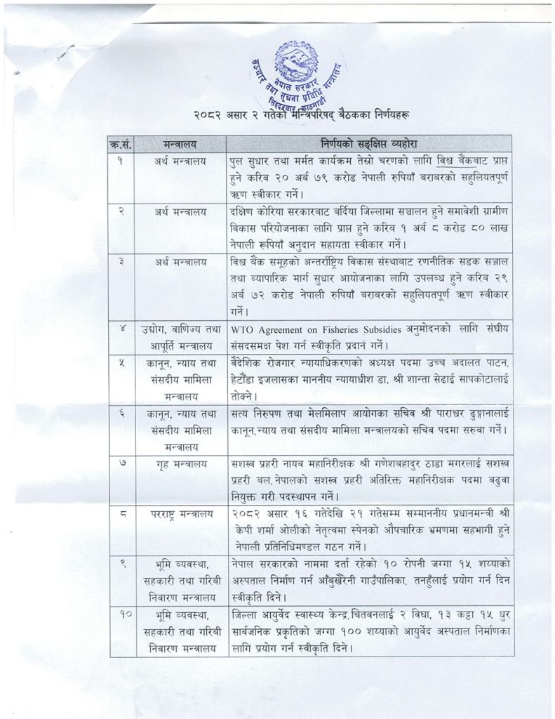 मन्त्री गुरुङका अनुसार सरकारले दक्षिण कोरिया सरकारबाट बर्दियामा सञ्चालन हुने समावेशी ग्रामीण विकास परियोजनाका लागि प्राप्त हुने झन्डै एक अर्ब आठ करोड ८० लाख रुपैयाँ अनुदान सहायता पनि स्वीकार गरेको छ साथै प्रधानमन्त्री केपी शर्मा अाेलीकाे स्पेन भ्रमण पनि स्विकृत गरेकाे छ ।