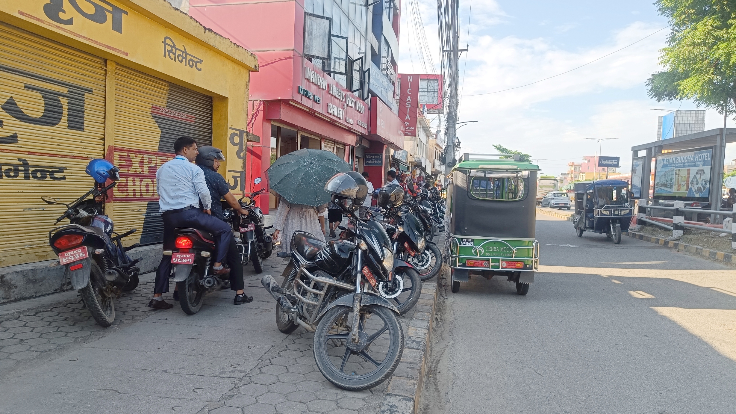 भैरहवामा फुटपाथमा पार्किङ, टर्न निषेधमा गाडी निरन्तर प्रवेश