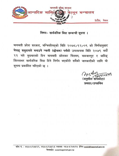 बागमतीका तीन जिल्लामा बुधबार सार्वजनिक बिदा